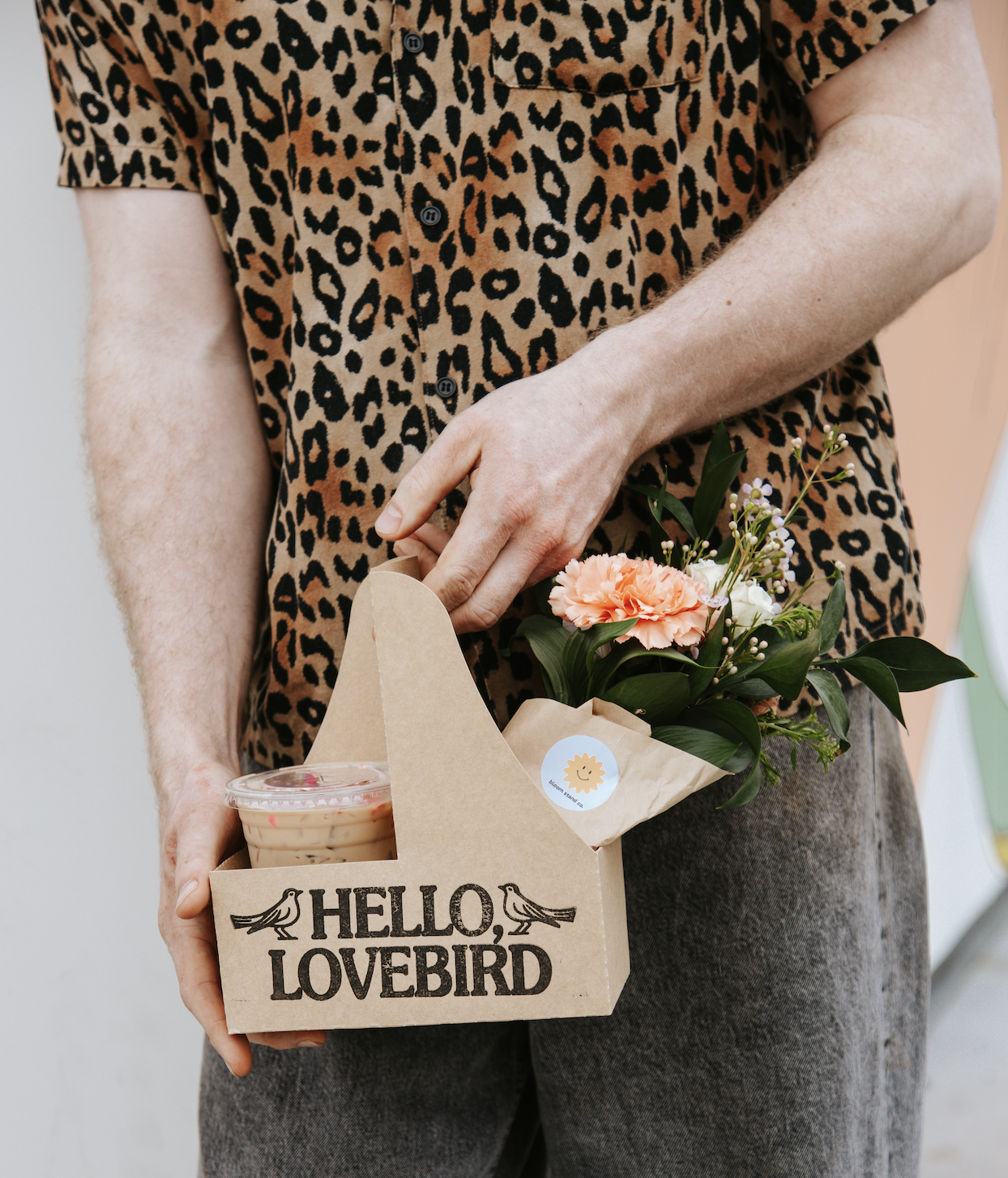 Locally crafted mini bouquet paired with a coffee of your choice in a custom drink carrier